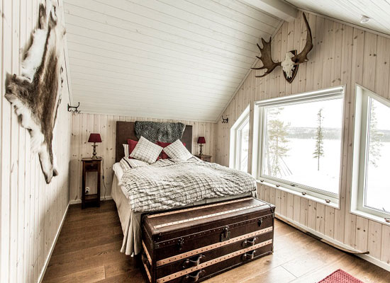 The private cabin itself is on the frozen shores of Lake Vakkara which is so remote that its only reachable by husky sled making this the perfect getaway from the everyday world. Internally there are three bedrooms and a large living space on the ground floor and luxurious master suite on the 1st floor complete with stunning views over the surrounding wilderness. In addition there is the added benefit of a sauna which overlooks the lake and is the perfect place to relax after a long day exploring.